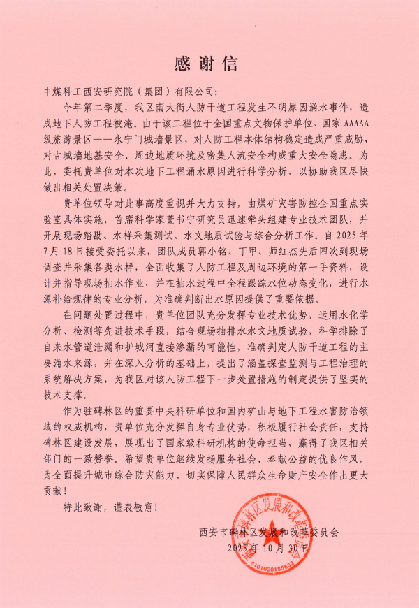 近日,西安研究院收到西安市碑林区发展和改革委员会发来的感谢信。信中对西安研究院在西安市南大街人防干道工程涌水来源分析事件中展现出的专业能力与责任担当表示感谢。