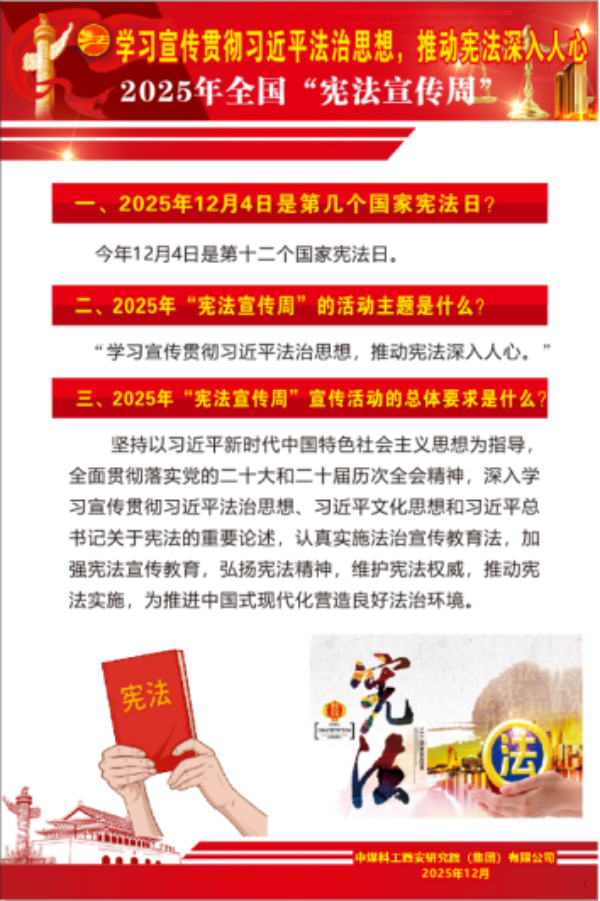 2025年12月4日是我国第十二个国家宪法日,为深入学习宣传贯彻习近平法治思想,全面落实中央全面依法治国工作会议精神,切实将“学习宣传贯彻习近平法治思想,推动宪法深入人心”的活动主题落到实处,西安研究院举办了2025年宪法宣传周活动,有效提升了全体职工的宪法意识与法治素养。