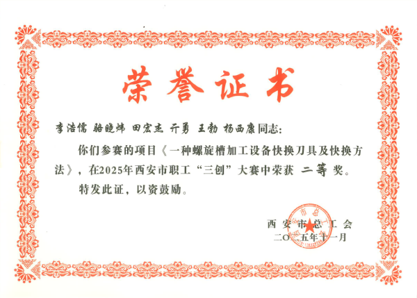 近日,在西安市总工会主办的职工“三创”大赛中,西安研究院李浩儒创新工作室完成的《一种螺旋槽加工设备快换刀具及快换方法》项目从初赛53家单位的139个参赛项目中成功晋级,最终在30个决赛项目中脱颖而出,荣获二等奖。 该项目聚焦螺旋槽铣床刀具更换效率低的痛点,将传统一体式刀盘创新优化为分体式轻量化快换结构,使换刀时间缩短66%,有效提升生产效率。团队自主研发的分体刀盘成本约为进口价格的1/3,大幅降低采购成本。同时,新结构减少了人员进入机床内部操作...