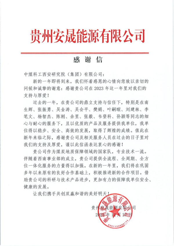 近日,西安研究院收到贵州安晟能源有限公司的感谢信,对其在煤炭地质保障领域的专业